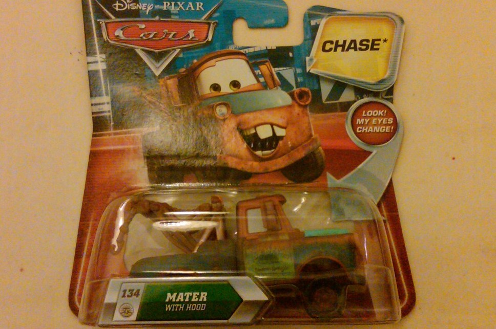 With Mater being arguably the most popular character in the line, his “Chase” cars tend to command a premium. The first two Mater “Chase” cars released were Mater with an oil can and Mater with a glowing lamp. In the Cars movie, Mater fished up his long-lost hood, paving the way for the third Mater “Chase” car, Mater with hood.